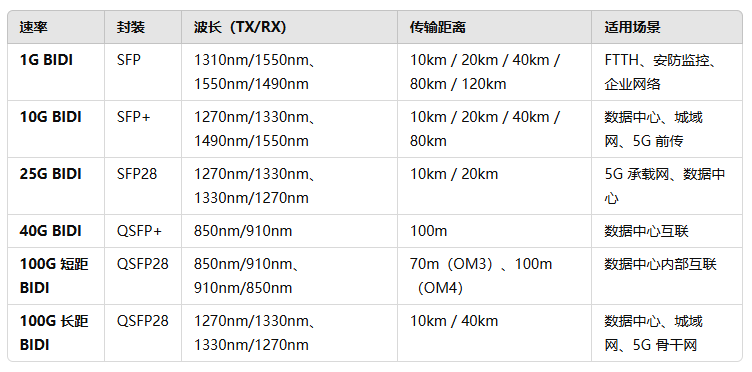 1G-100G 单纤双向 BIDI 光模块,不仅让您的网络传输速度更快,还能显著节省光纤资源和运维成本。特别是100G 单模 BIDI 光模块,在数据中心和骨干网领域,已成为光通信发展的新趋势!立即行动,抢占高速互联先机!