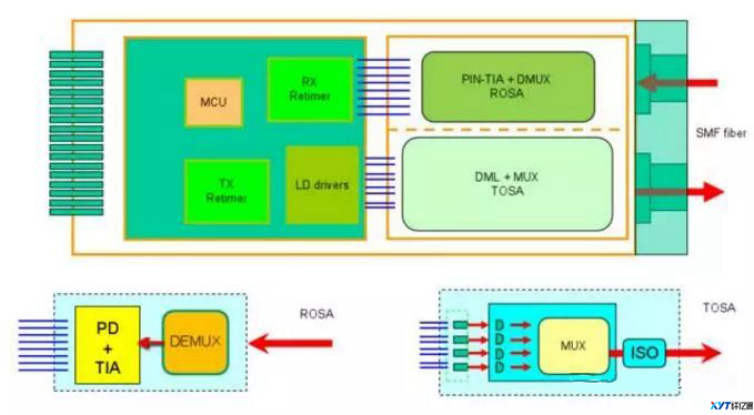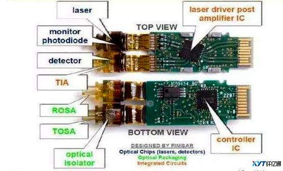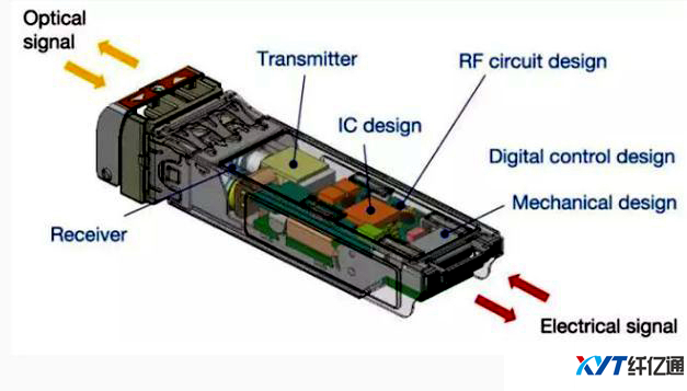 The optical module is an optoelectronic module that performs photoelectric and electro-optical conversion. The transmitting end of the optical module converts the electrical signal into an optical signal, and the receiving end restores the optical signal to an electrical signal. Its internal structure is as follows:
